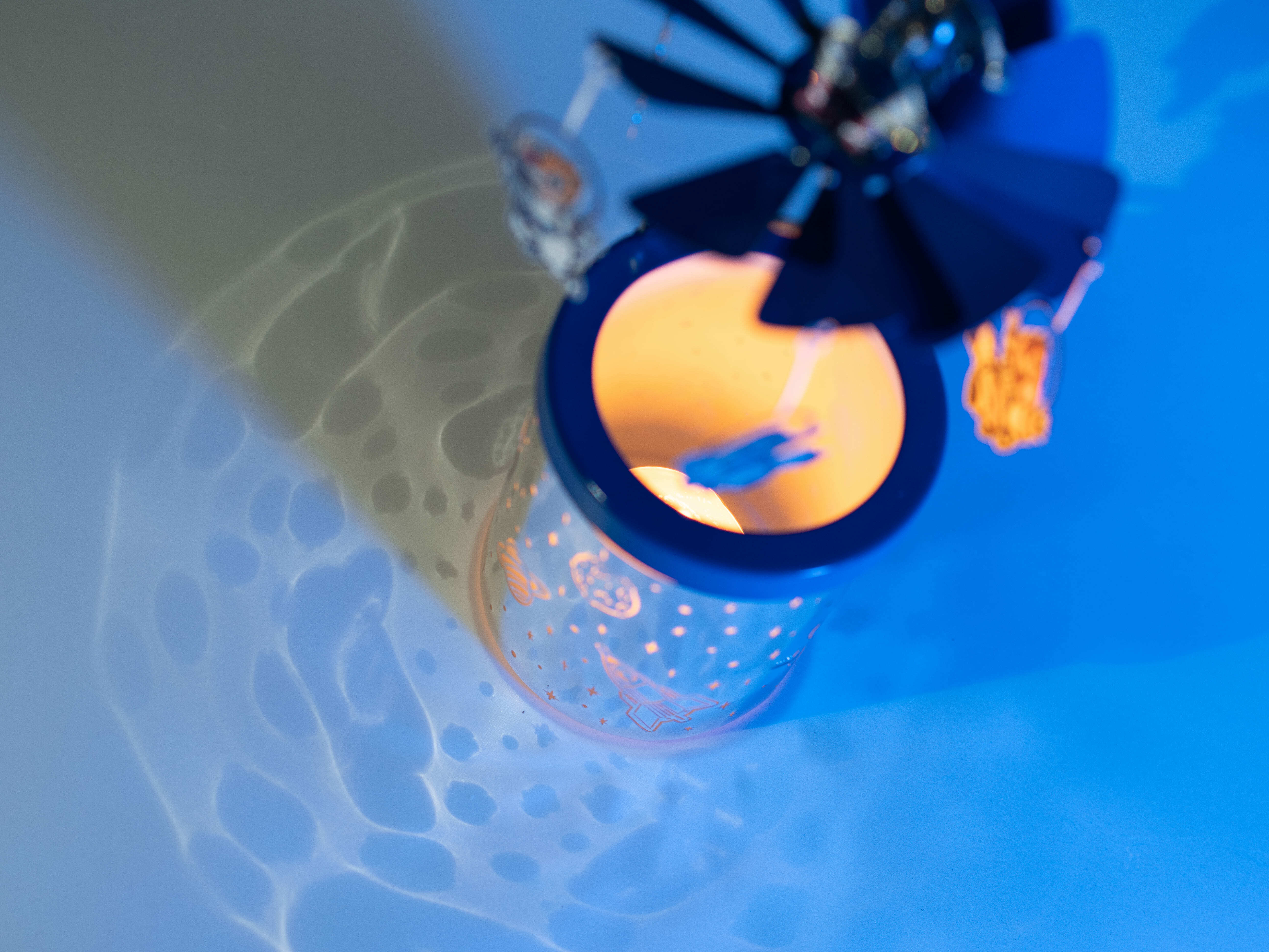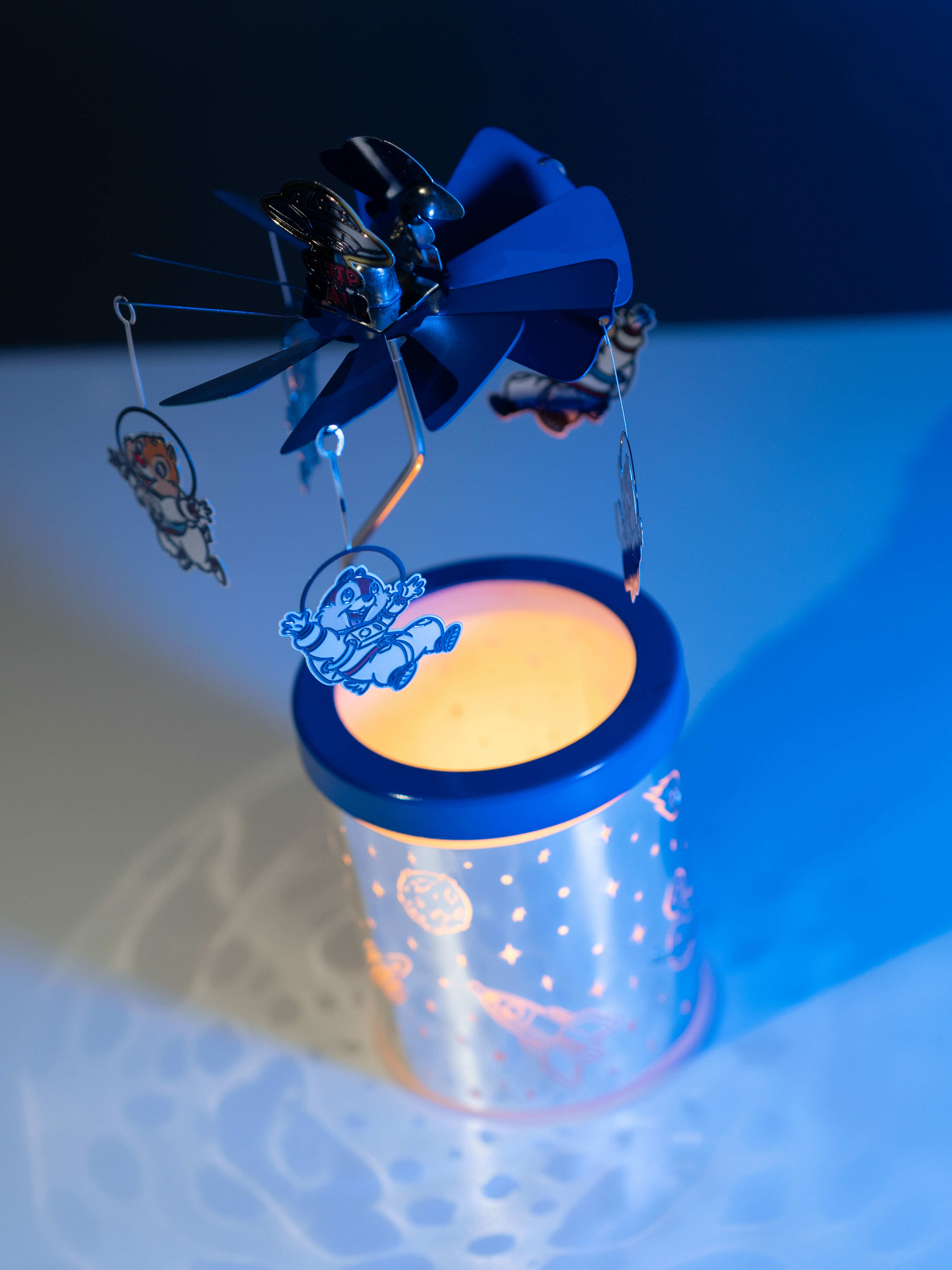 這款全彩色設計的鋼牙與大鼻旋轉蠟燭台,安裝簡易,彩色金屬掛飾閃閃發光,隨著蠟燭點燃後熱空氣上升,扇葉緩緩自動旋轉,成就了一個輕鬆歡樂的氣氛。